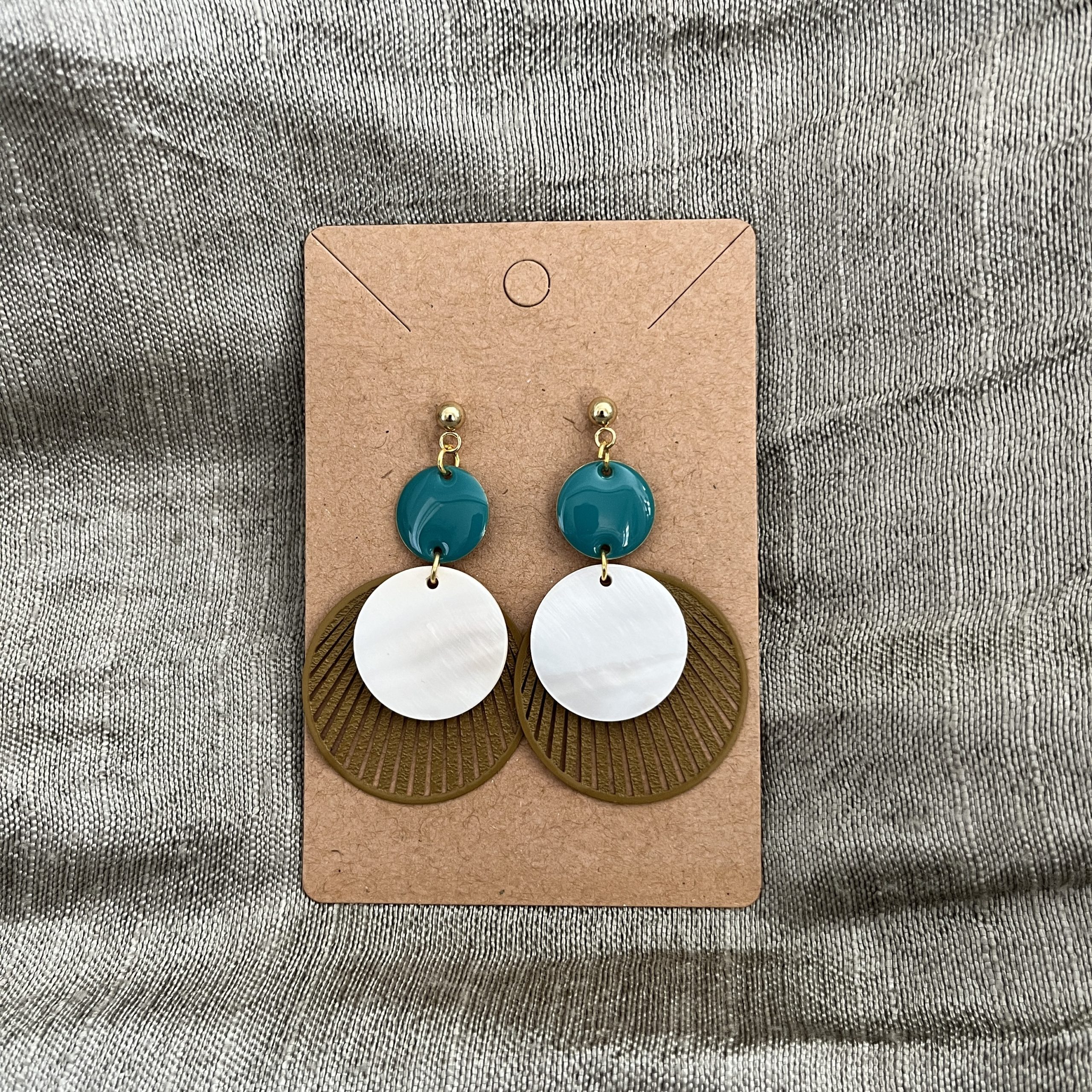 Boucles d’oreilles avec crochets en acier inoxydable; sequins émaillés de couleur pétrole et disques nacrés.