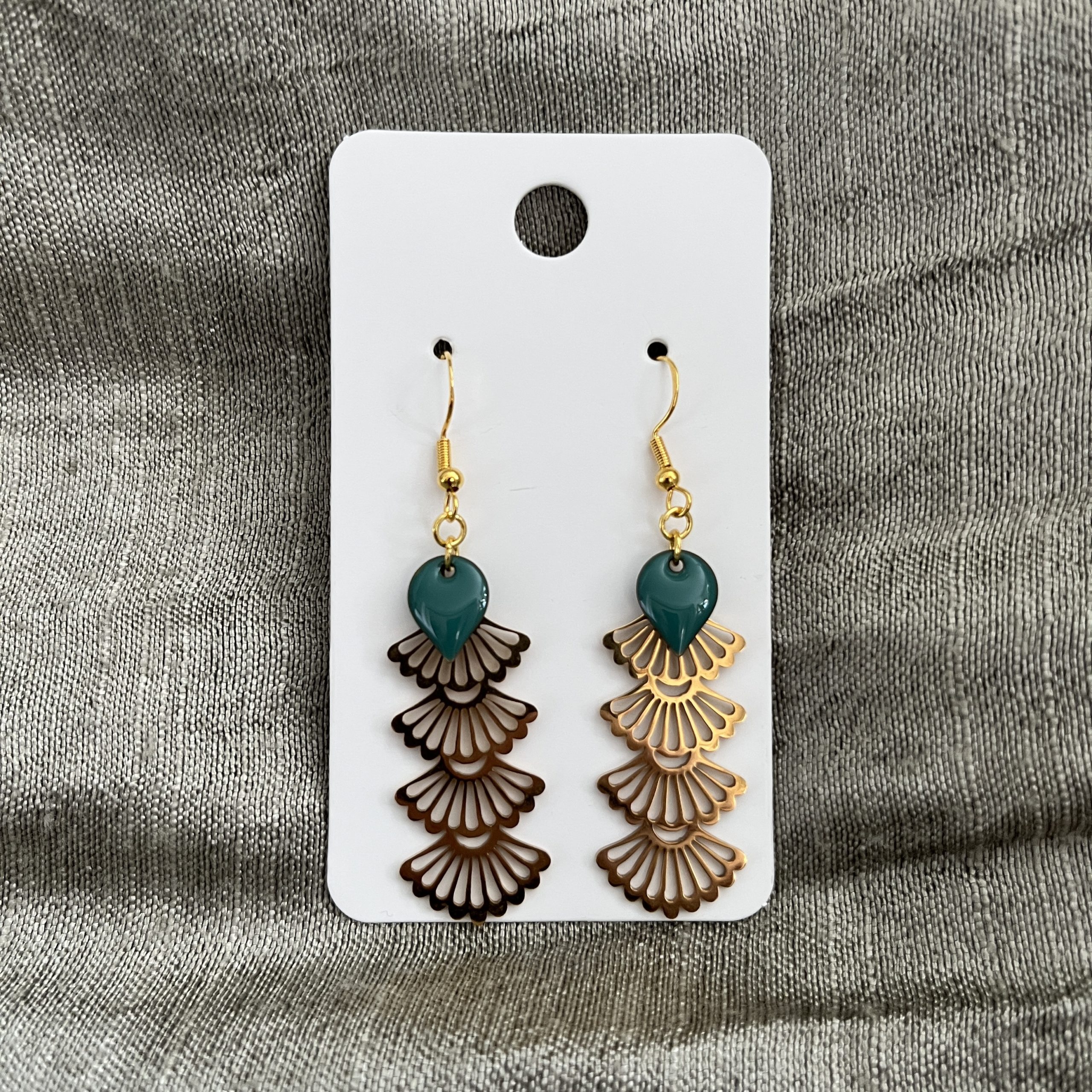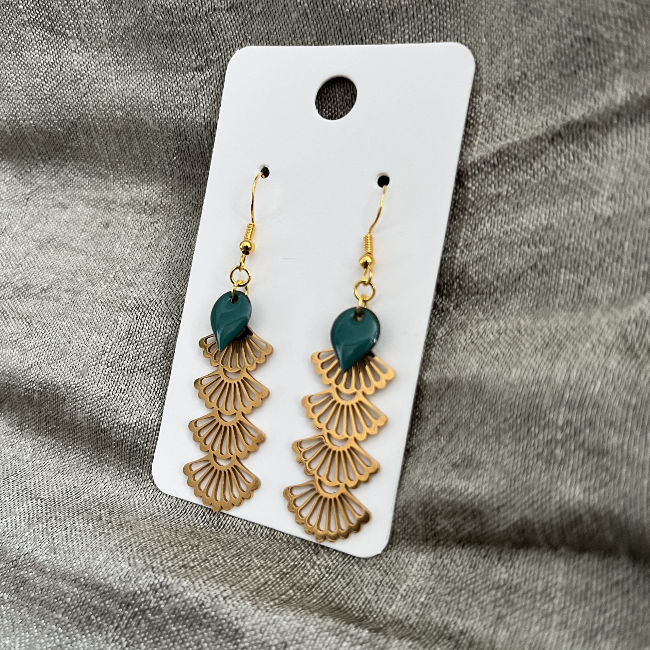 Boucles d’oreilles avec crochets en acier inoxydable; sequins émaillés couleur pétrole.