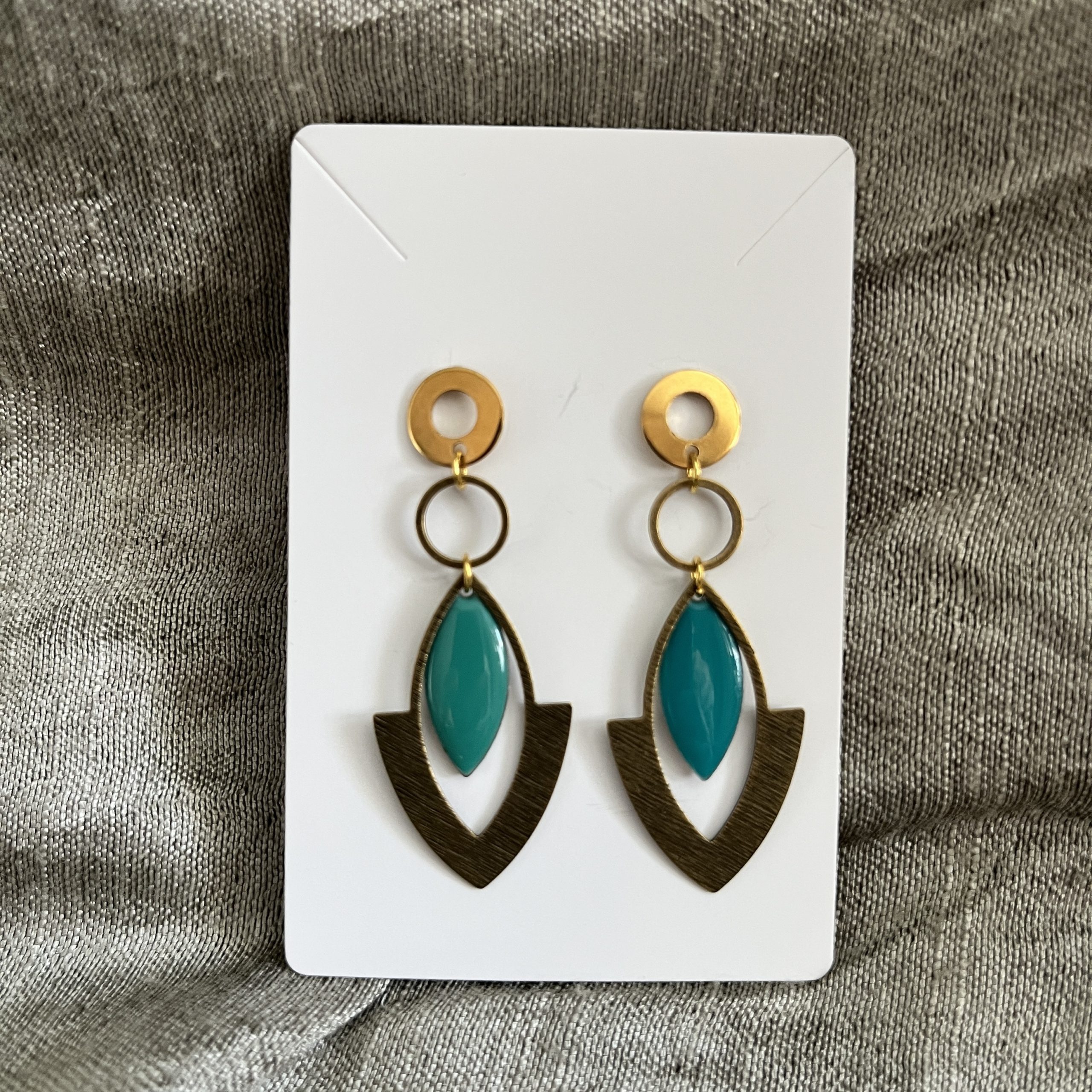 Boucles d’oreilles avec crochets en acier inoxydable; sequins émaillés en pétrole clair et pétrole foncé.