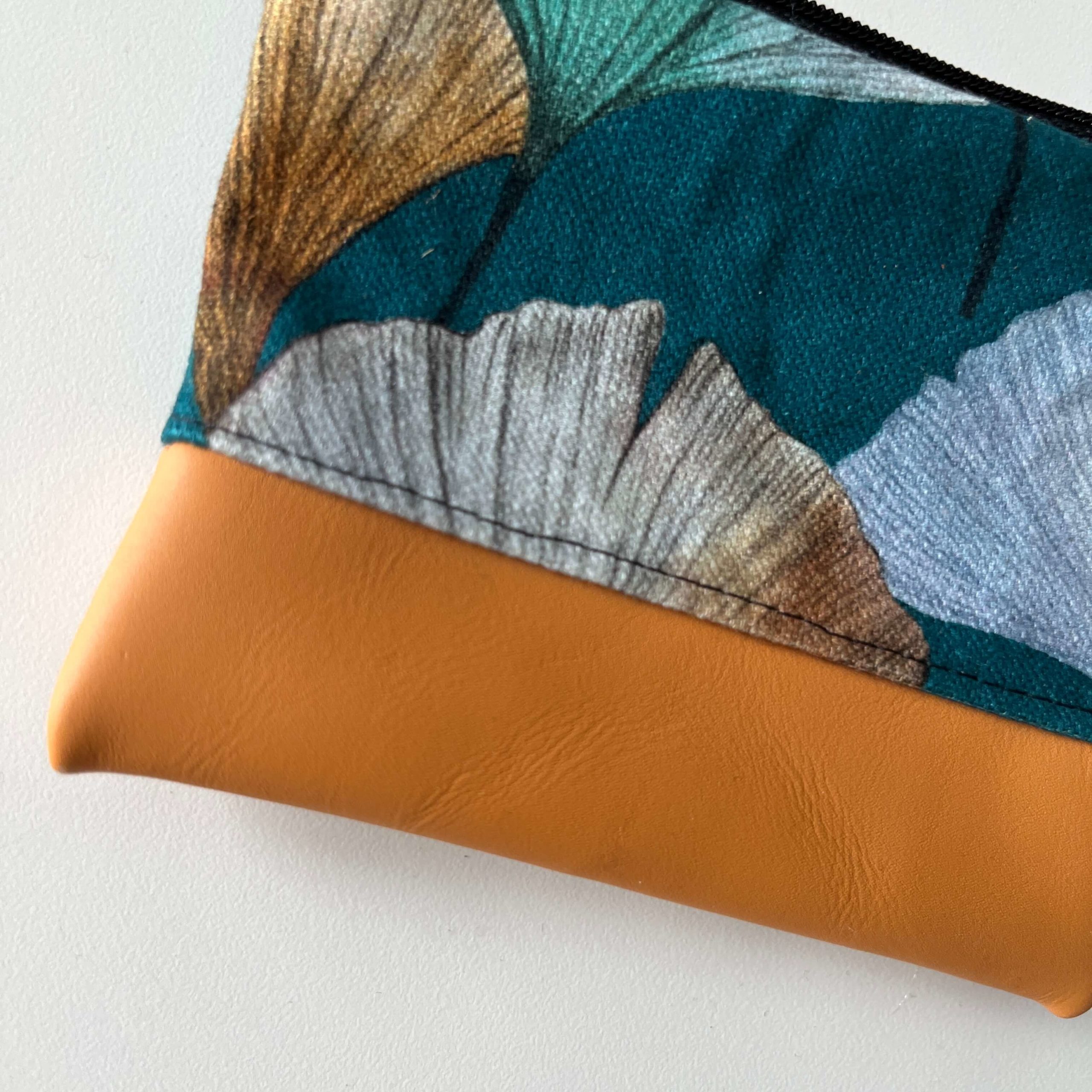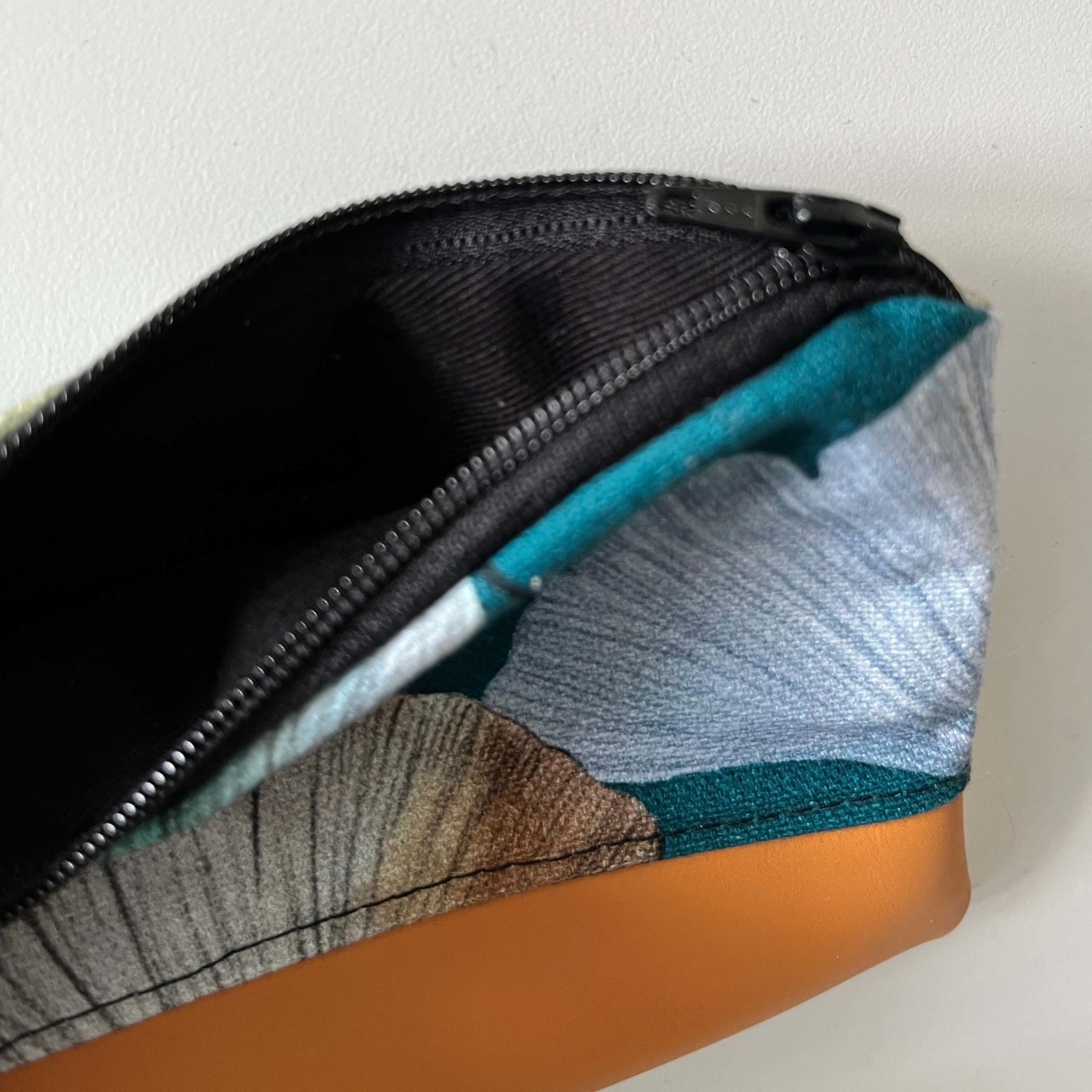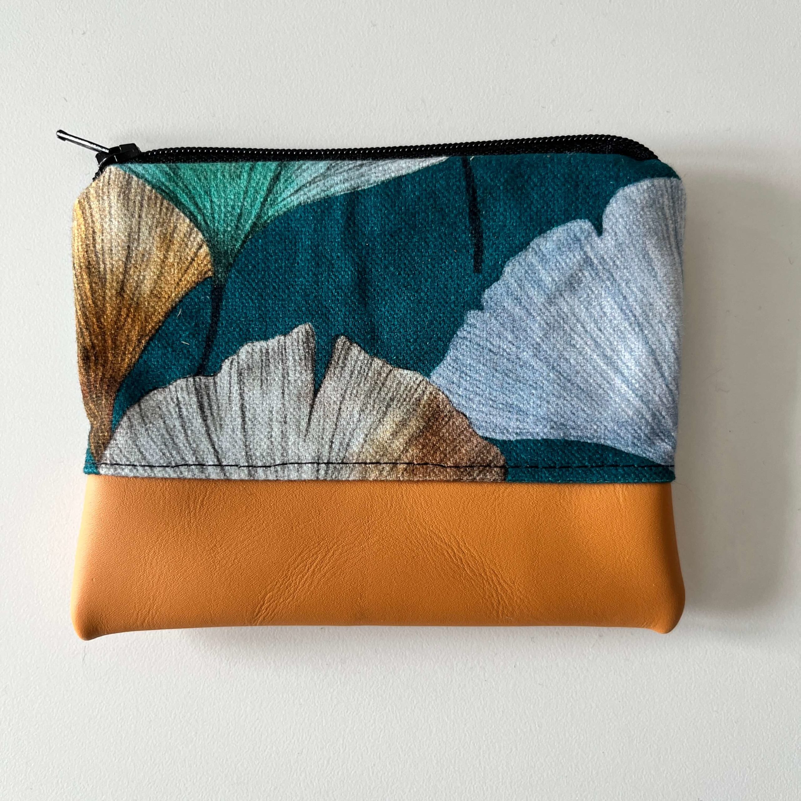 Porte-monnaie en coton entoilé et doublé. Fond en cuir. Dimensions 13 x 10.5 cm.